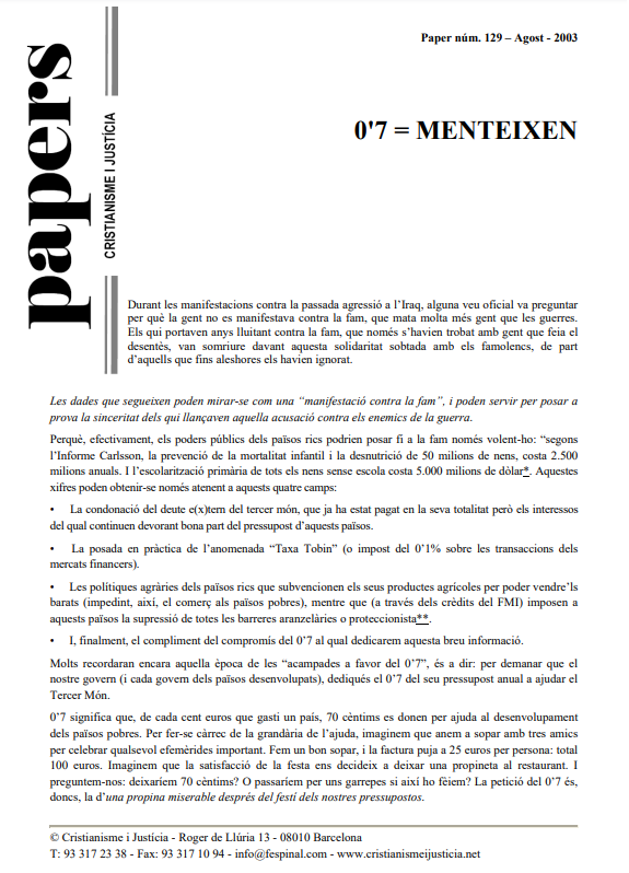 Reflexió sobre el 0,7% d’ajuda al desenvolupament. El document demostra la misèria que representa dedicar al desenvolupament el 0,7% del pressupost nacional. I malgrat ser una misèria, la majoria dels estats no el compleixen. Espanya difícilment ha passat del 0,2 o 0,3. Els més generosos són els països nòrdics. Tampoc les comunitats autònomes i els ajuntaments són més generosos. Les grans capitals a la cua i les comunitats que s’ auto administren al davant, com Euskadi i Navarra. I cal saber també on van a parar els diners i en quines condicions.