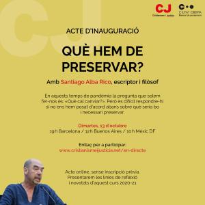 Aquest dimarts ha tingut lloc la inauguració del curs 2020-21 del Centre d’Estudis Cristianisme i Justícia, que aquest any s’ha fet amb un acte online. El filòsof Santiago Alba Rico ha estat l’encarregat de pronunciar la ponència inaugural, en connexió des de Tunis, amb una reflexió sobre què és el que cal preservar, en aquests moments en què sembla que l’únic que ens preocupa és què cal canviar.