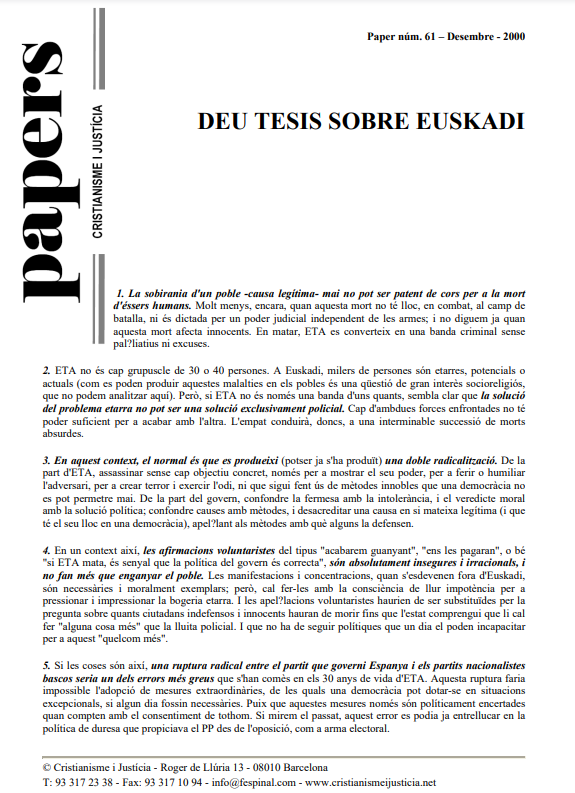 El Consell Directiu de CiJ reflexiona sobre la situació basca. Partint de l’afirmació que la sobirania d’un poble és un dret legítim, s’afirma que aquest dret no pot dur a assassinar éssers humans. La qüestió basca no tindrà una solució estrictament policial. Un 50% dels bascos es consideren fonamentalment bascos i l’altre 50% espanyols en major o menor grau. En una situació així cal diàleg. Encara més quan, en els orígens del conflicte, hi ha les ofenses al poble basc inferides pels governs espanyols.