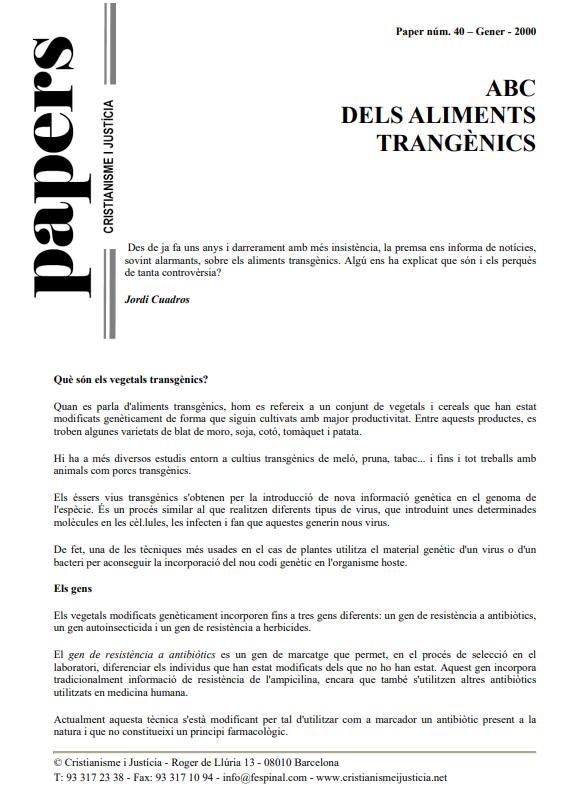 Davant la proliferació de vegetals modificats genèticament i després de comentar els diversos gens que s’han alterat, Cuadros planteja els pros i contres del conreu d’aquestes espècies. Pros com major producció i la possibilitat d’acabar amb la fam al món i contres com manca de transparència i de seguretat per a la salut, manca de justificació ètica, efectes sobre la biodiversitat, i, qui sap, l’aparició de bacteris més resistents. I podríem acabar depenent tots els comensals d’unes poques i potentíssimes transnacionals, com Monsanto.