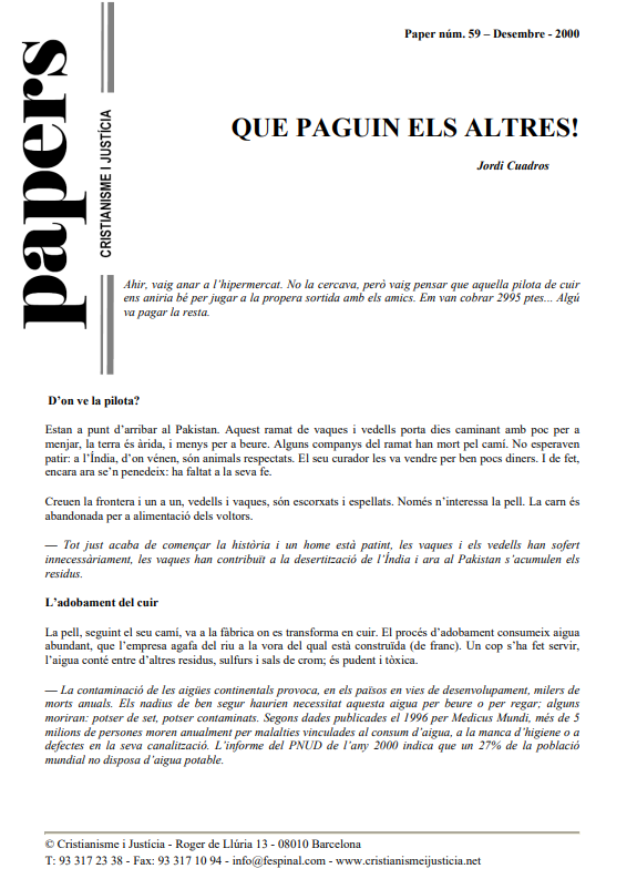 Seguint el procés de fabricació d’una pilota al Paquistan ens podem adonar dels costos socials, sanitaris, ambientals, laborals, educatius,... que té aquesta producció. Explotació infantil i infants sense accés al sistema educatiu, patiment dels animals, contaminació d’aigües i terrenys i malalties que se’n deriven, transport a llarga distancia,... Així, quan comprem una pilota, paguem tan sols una part del seu veritable cost. L’altra part la paguen els qui la fabriquen i tots els qui sofreixen les conseqüències d’aquesta fabricació. El Paper fa una crida al consum responsable i al desenvolupament sostenible.