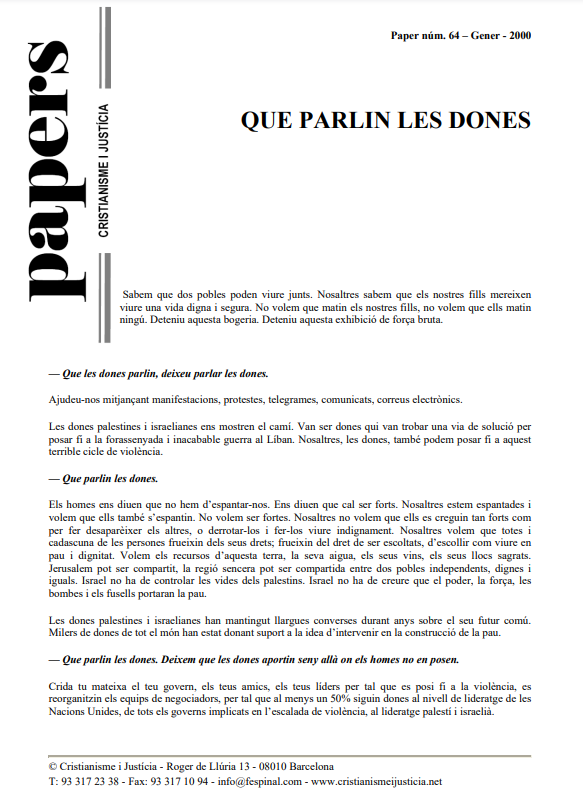 La qüestió de la dona i del femení torna a escena, tant en el món seglar com en l’eclesial. ¿És perquè les dones assumeixen papers destacats en un món convuls, violent i bellugadís? ¿És perquè el papa Francesc reprèn aquest tema una i altra vegada? Sigui pel motiu que sigui, en aquest moment, quan el món, com un tot, es troba immers en la violència i afronta tants problemes econòmics, polítics i socials, hi ha la sensació més o menys estesa que la dona pot ser una protagonista important en els processos de canvi. L’autora va participar en la inauguració del curs de Cristianisme i Justícia 2017-2018. En aquest quadern es recull bona part del contingut d’aquella ponència inaugural.