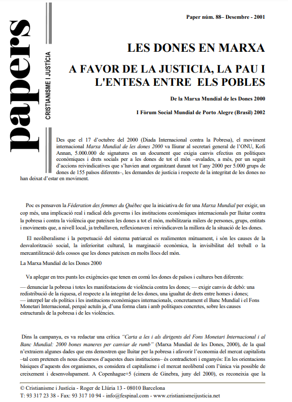 La Marxa de les dones, a iniciativa del Quebec, ha assolit un gran èxit de mobilització i ha lliurat una carta, recolzada per 5.000.000 de signatures, al secretari de l’ONU, K. Annan. Es posava en evidència que la dona és la gran damnificada per la globalització i que és la més afectada per la pobresa i la violència. També el Fòrum Social Mundial de Porto Alegre treballa per reduir les diferències al món i cerca alternatives a l’economia i a la política actuals.