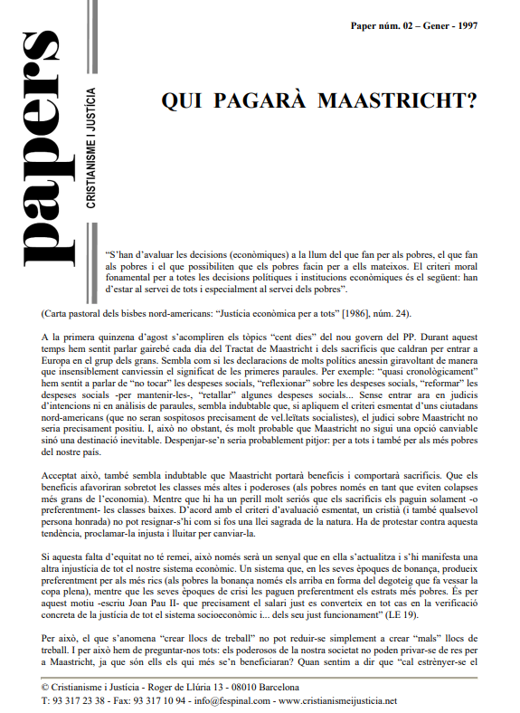 Partint de la Carta pastoral dels bisbes nord-americans: "Justícia econòmica per a tots", sobre els pobres, es dona una visió crítica del que pot representar Maastricht (plantejava política exterior i de seguretat comuna, unió econòmica i monetària, una ciutadania europea) per a la població més vulnerable. On aniran a parar els beneficis de la nova situació i qui pagarà les crisis? Pregunta important en l'inici d'una nova etapa, quan el capitalisme habitualment afavoreix el capital per sobre del treball. Joan Pau II ja feia referència al sistema d'injustícia que pesava sobre l'home treballador.