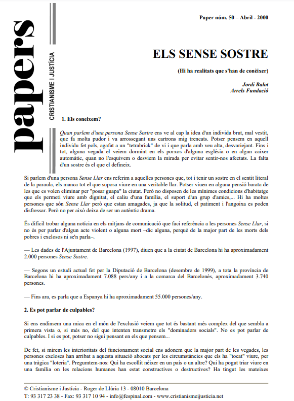 Sense sostre i sense llar són expressions que fan referència a persones que es troben en la més absoluta precarietat. És difícil parlar de culpables. Hi ha causes estructurals, com el sistema econòmic i educatiu, i problemes per accedir a la sanitat o als recursos socials. Són persones que considerem molestes. Persones a qui cal ajudar a recuperar la seva dignitat humana. Es pregunta Jordi Balot, d’Arrels, si cal inserir-los. I, si la resposta és afirmativa, la reinserció s’ha de fer amb molta cura i paciència, atenent a cada persona concreta.