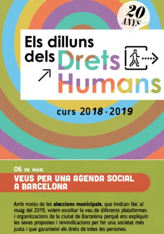 Amb motiu de les eleccions municipals del pròxim 26 de maig de 2019, al Cicle dels Dilluns dels Drets Humans 2018/2019 volem escoltar la veu de diferents plataformes i organitzacions de la ciutat de Barcelona perquè puguin fer arribar les seves propostes i reivindicacions, per fer una societat més justa i que garanteixi els drets de totes les persones, a representants de diferents partits polítics.