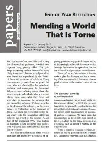 We take leave of the year 2016 with a long list of unresolved problems, to which new ruptures keep getting added. The pain keeps increasing, and the deaths of so many “saints Innocents” threaten to eclipse whatever hopes are engendered by the “birth” of many initiatives of solidarity. Those of us at Cristianisme i Justícia want to make a plea for dialogue and debate so as to keep from advancing toward the precipice. For, despite all the evidence, our faith in humanity and in what is most sacred therein encourages us to believe that we can help to turn the tide.