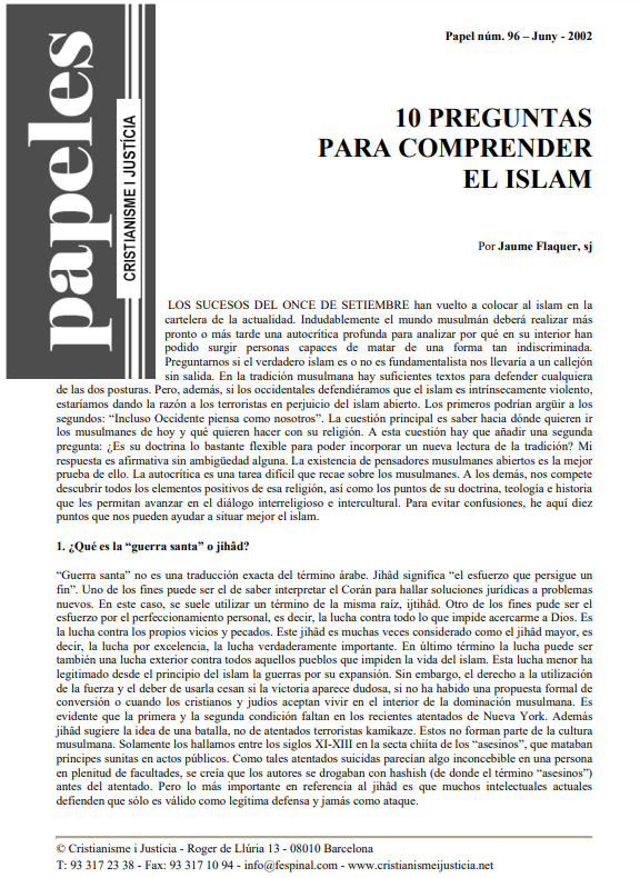 Los atentados del 11-S han puesto el Islam de actualidad. Y una pregunta habitual ha sido por qué algunos musulmanes están dispuestos a matar indiscriminadamente e incluso a suicidarse para conseguir sus propósitos. ¿Todo es fundamentalismo o también hay pensadores abiertos al diálogo? Jaume Flaquer, con diez preguntas y respuestas, nos ayuda a tener una visión correcta del Islam, desde la yihad a la Umma o desde las causas del fundamentalismo a las diferentes maneras de ver a Jesús.