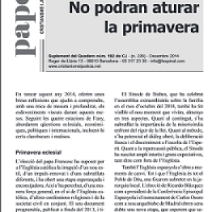 El centro de estudios Cristianisme i Justícia, juntamente con el centro entreParéntesis, cierran el año con la publicación de una reflexión que recoge las inquietudes y los hitos más relevantes del 2014 y con la celebración de una vigilia de oración para fin de año el día 31 de diciembre a las 23:00h en la iglesia de los Jesuitas de la calle Casp de Barcelona.La declaración de Fin de Año lleva por título "no podrán detener la primavera" y, siguiendo las cuatro estaciones del año, aborda cuestiones eclesiales, económicas, políticas e internacionales.