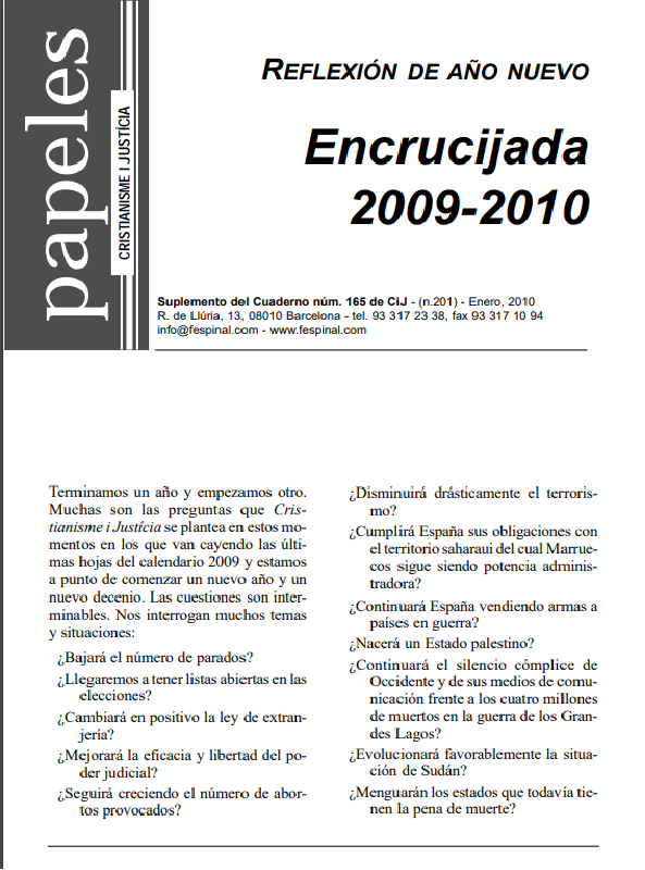A punto de entrar en una nueva década, el texto se plantea múltiples cuestiones desde la óptica de la justicia, la solidaridad y los DDHH. Destaca una: ¿Superar la crisis sin profundas reformas sociales? Se hace un repaso de lo que ha sucedido durante los años anteriores y se pregunta sobre el futuro a medio plazo: sueldos, trabajo, Naciones Unidas, proteccionismo, paraísos fiscales, salud, igualdad de género, dictaduras, medio ambiente, ... Y una afirmación: son necesarias transformaciones a fondo
