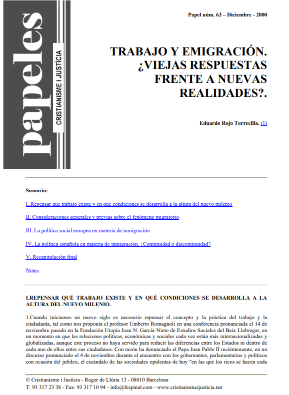 La lectura apasionante y apasionada de estos testimonios, a pesar de ser muy diversos ya que son personales, nos acercan mucho mejor a la realidad que cualquier reflexión teórica. Por eso, este cuaderno completa el que se publicó en el nº 17 de esta misma colección: Curas obreros. Entre la Iglesia y el Reino. Los tres itinerarios personales -Manolo, Sisco y Ramiro- confluyen en unos rasgos comunes que son como el substrato más hondo de su testimonio de fe dentro del mundo obrero. Un mundo que, a pesar de estar viviendo crucialmente profundas transformaciones debido a las nuevas tecnologías, nos interpela como personas y como creyentes con una pregunta como la que los trabajadores de Euskalduna, en una lucha reciente, escribían en el techo de las inmensas naves desiertas: “¿Dónde estás, justicia?”.