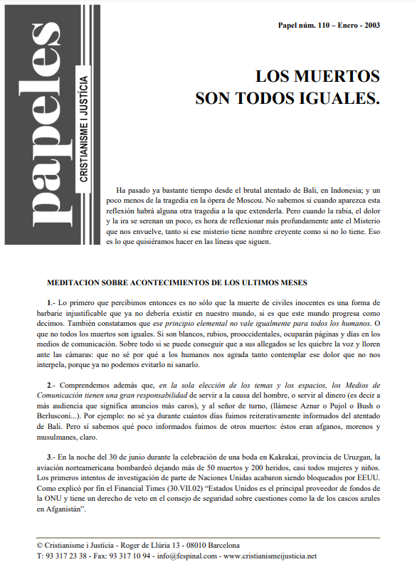 Bajo el título "Los muertos son todos iguales", una reflexión sobre el trato diferente que se da en Occidente a las víctimas de atentados o hechos de guerra según sean occidentales o no. Pasan casi desapercibidas cuando el verdugo es un país de nuestro entorno o de nuestra cultura. También se remarca que el miedo se encuentra en el origen de muchos de los hechos execrables que se producen en el mundo y que un mal no justifica otro mal. Todas las personas tienen la misma dignidad humana.