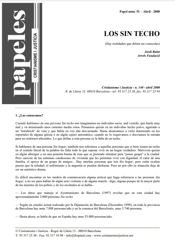 Sin techo y sin hogar son expresiones que se refieren a personas que se encuentran en la más absoluta precariedad. Es difícil hablar de culpables. Hay causas estructurales, como el sistema económico y educativo, y problemas para acceder a la sanidad o los recursos sociales. Son personas que consideramos molestas. Personas a las que hay que ayudar a recuperar su dignidad humana. Se pregunta Jordi Balot, de Arrels, si es necesario insertarlos. Y, si la respuesta es afirmativa, la reinserción debe hacerse con mucho cuidado y paciencia, atendiendo a cada persona concreta.