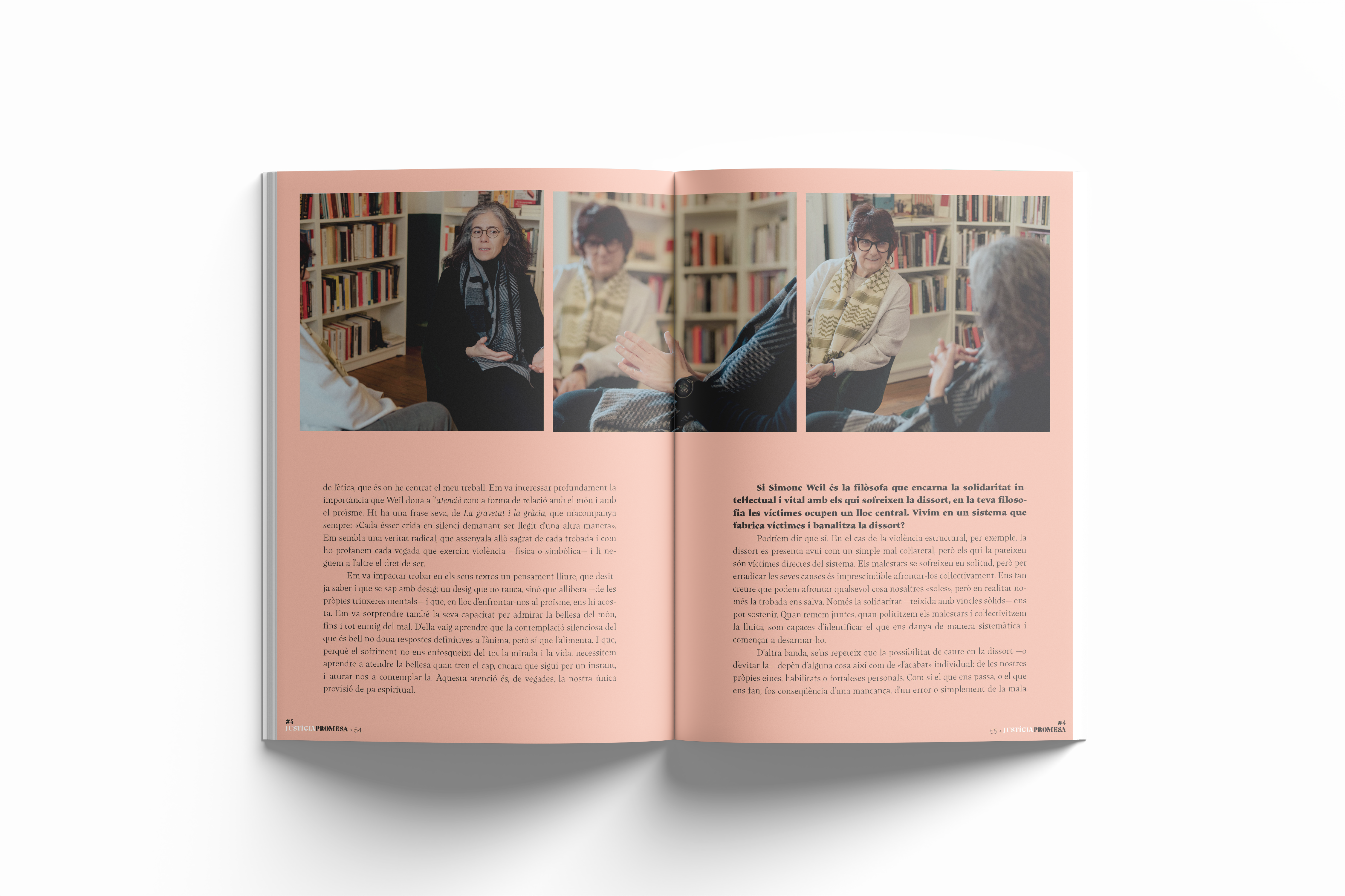 La entrevista, también de Pepa Torres, está dirigida a Olga Belmonte, filósofa que hace del sufrimiento y la injusticia el eje central de su pensamiento. Belmonte se inspira en Simone Weil y, en medio de tanto dolor, rescata su inquietud por la belleza: esos pequeños momentos que pueden convertirse en luces que iluminan la oscuridad del sufrimiento.