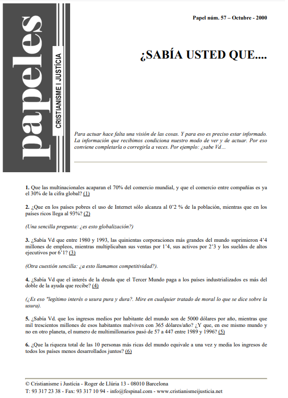 Saber cuál es la realidad del mundo mediante una serie de preguntas. Una buena reflexión sobre cuestiones como la globalización, la competitividad, la deuda externa, el acaparamiento de la riqueza, el tráfico de armas, la democracia, el mercado, la huella ecológica o el índice de pobreza en Cataluña. Una constatación de que nuestro planeta no funciona demasiado bien para la mayoría de la población.