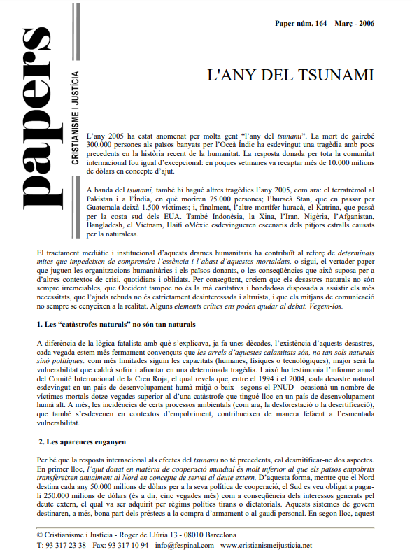 Subscripció al butlletíEl 2005 va ser un any marcat per “catàstrofes naturals”, en especial el Tsunami que acabà amb la vida de 300.000 persones. Cal analitzar les diferents conseqüències de les catàstrofes segons països i les ajudes atorgades per estats i ONG. Ni totes les catàstrofes són tan naturals, dos terratrèmols d’igual intensitat no afecten per igual Xile i Haití. Ni totes les ajudes són tan desinteressades. Cal veure què s’amaga al darrera de tanta prodigalitat, com cal estudiar l’AOD espanyola.