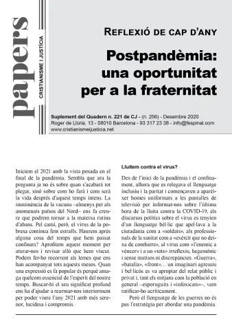 El centre també lamenta el llenguatge i l’imaginari bèl·lic que, en decretar-se la pandèmia, es va apropiar del relat públic, referint-se a la guerra contra el virus i als exèrcits que combatien l’enemic. En la seva reflexió de final d’any, Cristianisme i Justícia recorda que la manera d’afrontar una epidèmia no és amb un llenguatge que convoqui al combat sino a construir alternatives des de l’atenció, la presència, l’acompanyament, el consol i la resiliència.