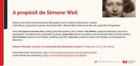 José Ignacio González Faus, teòleg, autor del del quadern Llum i ombres (a propòsit de Simone Weil)Pau Matheu, graduat en filosofia, autor de la presentació i la traducció de La gravetat i la gràciaJosep Otón, doctor en història, autor de Simone Weil: el silencio de DiosOriol Quintana, doctor en humanitats.Rosa Rius, professora titular de Filosofia a la Universitat de Barcelona