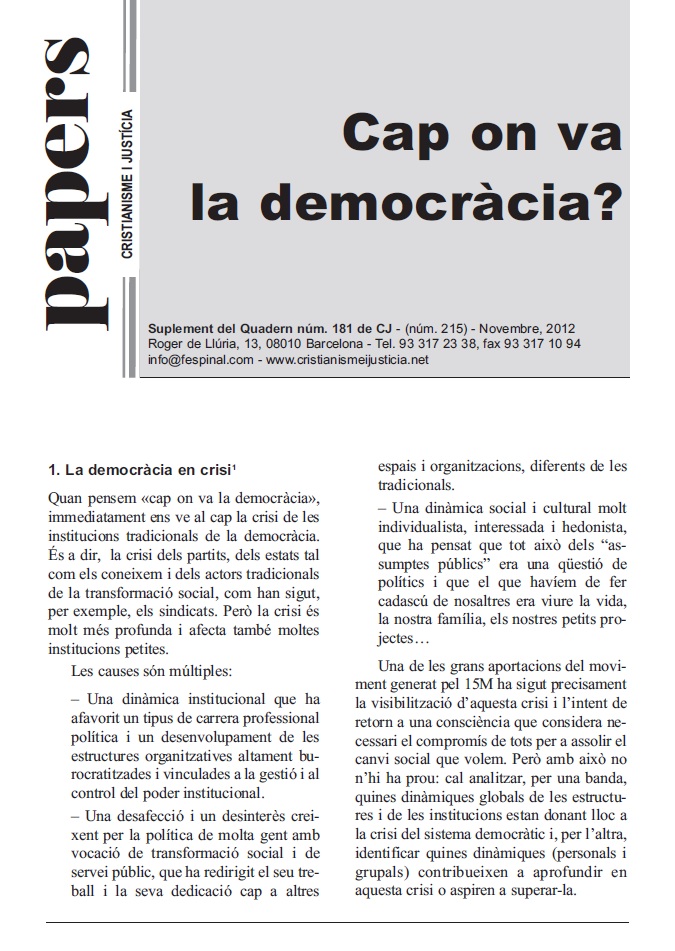 Subscripció al butlletíQuan pensem «cap on va la democràcia”, immediatament ens ve al cap la crisi de les institucions tradicionals. És a dir, els partits, els estats tal com els coneixem o actors tradicionals de la transformació social, com per exemple, els sindicats. Però la crisi és molt més profunda i és precisament d’aquesta profunditat que ens parla aquest paper.