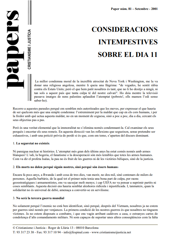 Davant els atemptats de l’11-S, reflexionant críticament, constatem que no existeix la seguretat total, que tots els morts són iguals, independentment de color, religió o nacionalitat, que no es tracta de la lluita del bé contra el mal, que no hi ha una superioritat moral d’uns, que per cert varen llençar la bomba atòmica i varen ensinistrar torturadors i dictadors llatinoamericans, sobre altres, per molt fonamentalistes que siguin, que si assassines, tortures, menysprees, la història et passarà factura.  Segons Galeano: “...fonamentalistes religiosos i fonamentalistes de mercat... comparteixen el mateix menyspreu per la vida humana...”.