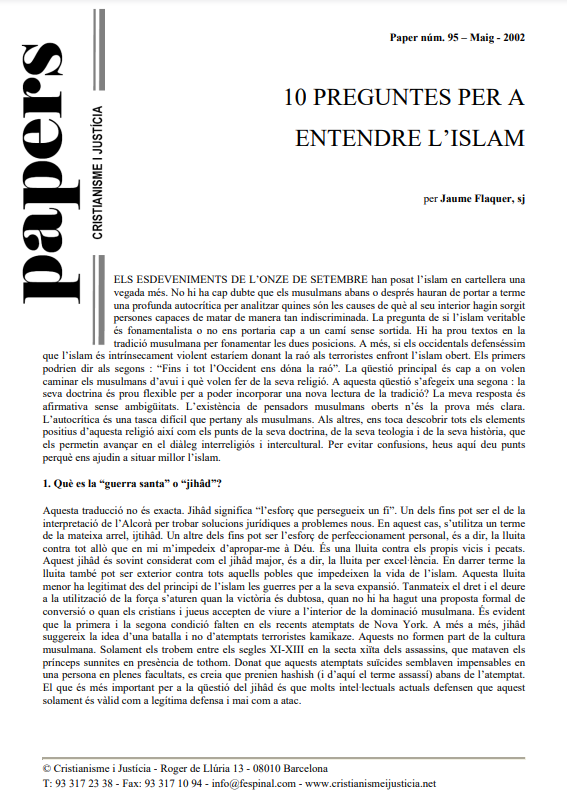 Els atemptats de l’11-S han posat l’Islam d’actualitat. I una pregunta habitual ha estat perquè alguns musulmans estan disposats a matar indiscriminadament i fins i tot a suïcidar-se per aconseguir els seus propòsits. Tot és fonamentalisme o també hi ha pensadors oberts al diàleg? Jaume Flaquer, amb deu preguntes i respostes, ens ajuda a tenir una visió correcta de l’Islam, des de la jihad a l’Umma o des de les causes del fonamentalisme a les diferents maneres de  veure Jesús.