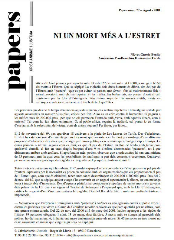 Denúncies i exigències de l’Associació Pro-Drets Humans de Tarifa. Denúncia de les màfies que cobren quantitats exorbitants als migrants que intenten arribar a Espanya creuant l’estret, de l’elevada xifra de morts en intentar-ho i de la violència exercida per l’estat espanyol en no acceptar-los. Exigència de derogació de la llei d’estrangeria, d’obrir fronteres, de no discriminar per nacionalitat, en definitiva, exigència d’actuar humanament. El paper acaba preguntant-se on son els assassins i qui pagarà per tantes víctimes innocents.