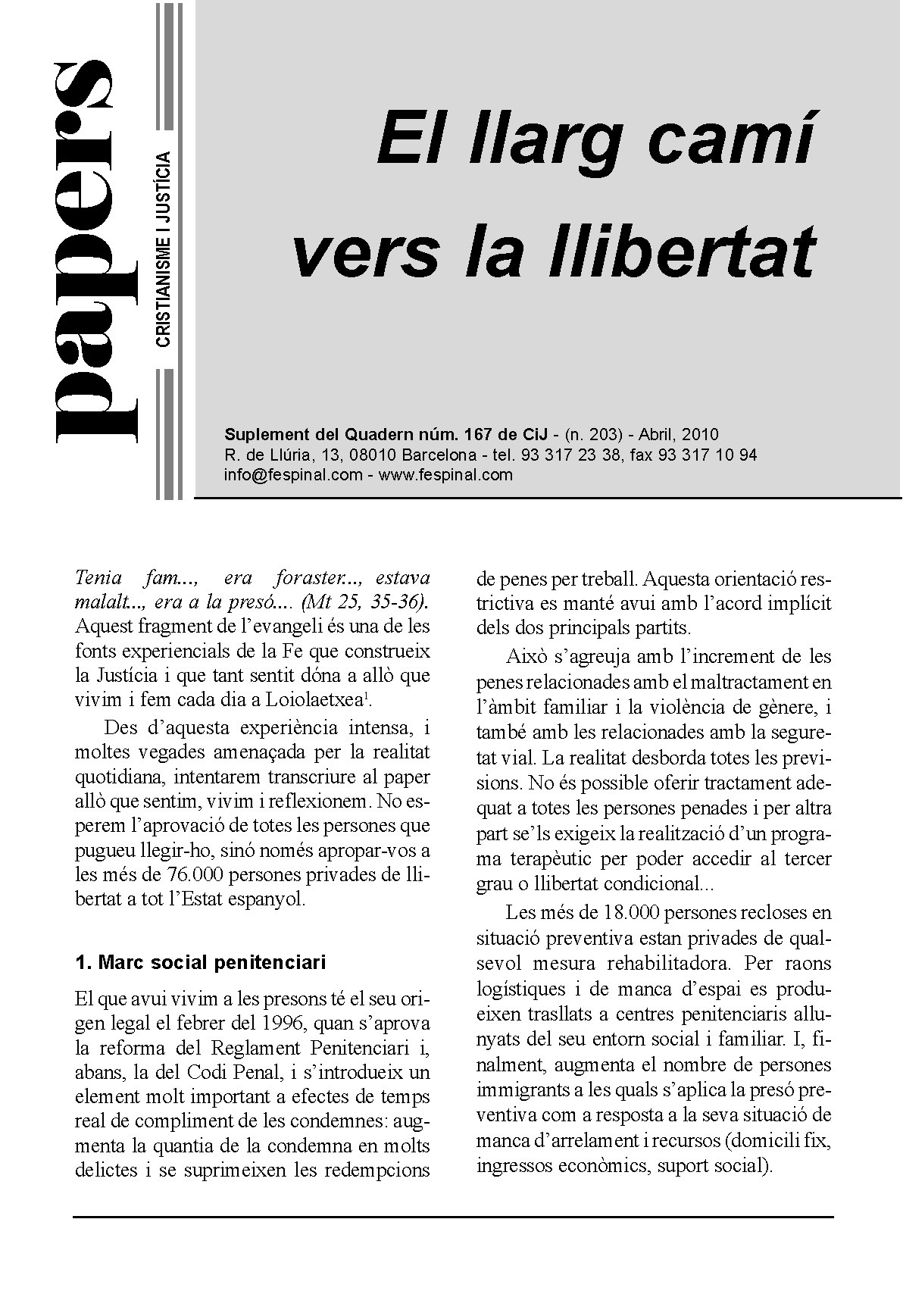 Reflexió crítica sobre el sistema penitenciari espanyol de Loiolaetxea, comunitat dels jesuïtes del País Basc, que vetlla per la reinserció social i laboral de persones que han estat empresonades i planteja alternatives a un sistema penitenciari punitiu. Les presons estan saturades i una reforma del Codi Penal augmenta la quantia de la condemna en molts delictes i se suprimeixen redempcions de penes per treball. A més a més, hi ha un abús de la presó preventiva. Diverses persones exposen com les ha ajudades Loiolaetxea.