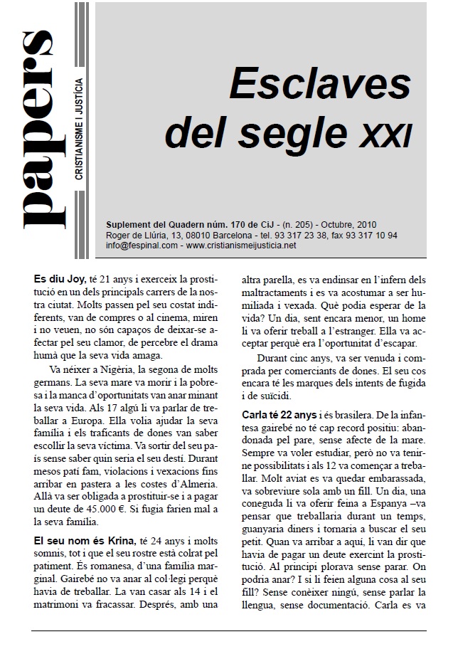 L’OIT quantifica en 2.500.000 el tràfic de persones en el món. La majoria dones i nenes. Prostitució, abusos, maltractaments, confiscació dels documents d’identitat, amenaces,... Es viola els drets de les persones i s’atempta contra la seva dignitat i integritat. La pobresa té rostre femení, a l’igual que l’esclavatge. A Espanya, gran part de les prostitutes són estrangeres, però el tràfic també afecta, a Espanya i al món, a sectors agraris i industrials, servei domèstic o mendicitat.