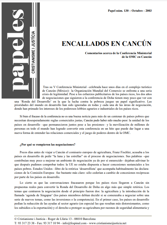 La Conferencia de la OMC en Cancún ha sido un fracaso, pero también ha significado un punto de inflexión, ya que los países del Sur han reivindicado sus derechos de forma solidaria. Estos acusan de dumping a EEUU y UE. Un ejemplo estridente es la subvención que recibe el algodón estadounidense de su gobierno. El Sur se negó a firmar un documento que privilegiaba al Norte. Movimientos sociales y ONG han trabajado para hacer del comercio internacional y de las instituciones que lo rige un instrumento para el desarrollo.