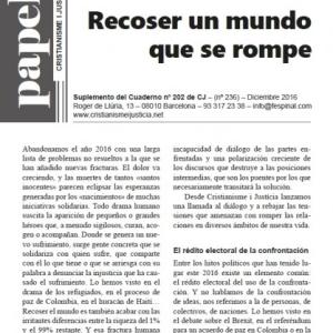 Cristianisme i Justícia, centro de estudios de la Compañía de Jesús en Cataluña, hace un llamamiento al diálogo en la reflexión que acaba de presentar al finalizar el año 2016. El centro lamenta que "gran parte de los problemas mundiales están causados ??por la incapacidad de diálogo de las partes enfrentadas".