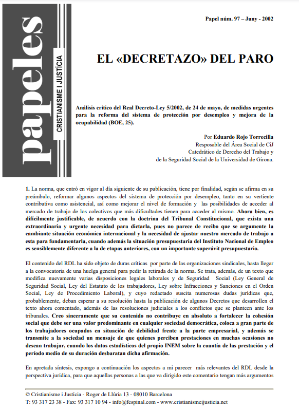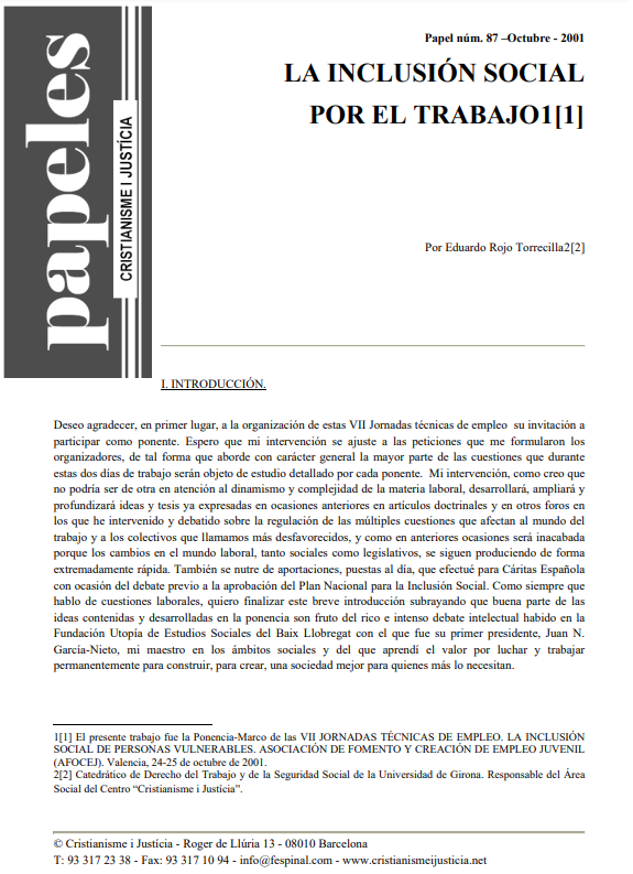 Este cuaderno es el resultado de la síntesis de un trabajo de seminario. Intentar ofrecer soluciones globales y definitivas al problema del paro puede ser una pretensión ilusoria e ingenua. Somos conscientes de ello. Pero la magnitud y complejidad del fenómeno de la creciente desocupación plantea la necesidad de la búsqueda de soluciones con el máximo rigor y urgencia posibles. El resultado de este esfuerzo, junto con otros intentos similares, puede ofrecer en todo caso una nueva luz, unos caminos inéditos todavía para superar uno de los hechos más dramáticos de nuestro tiempo: millones de hombres y mujeres, sobre todo jóvenes, se ven expulsados del mercado de trabajo y obligados a refugiarse en una "marginación sin retorno".