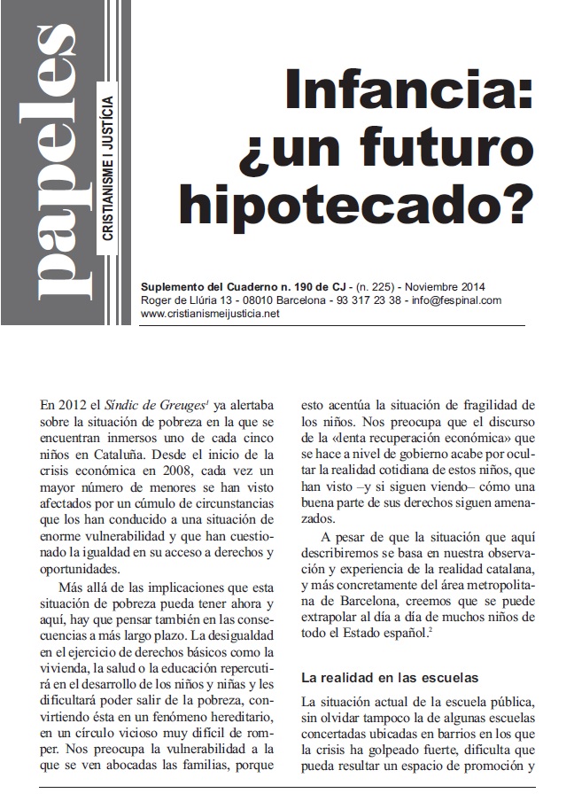 Los autores nos trasladan en este Papel su preocupación sobre el impacto que está teniendo la crisis en los niños y niñas de nuestro país. Su tesis es clara: la coyuntura desfavorable en la que viven nuestros niños no es sólo una cuestión económica sino que se trata de una situación social de urgencia que afecta al presente, pero que hipotecará el futuro de varias generaciones.