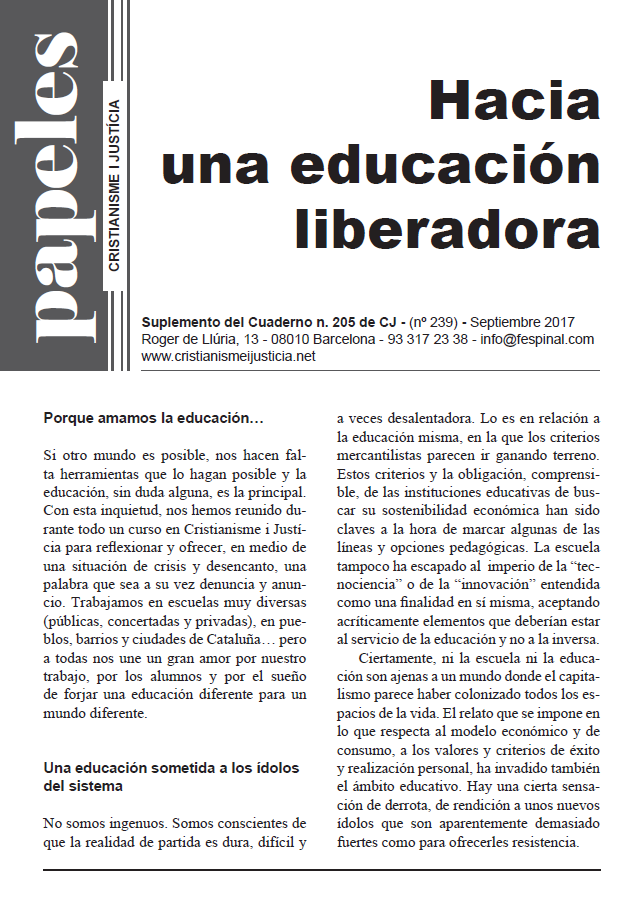 Si otro mundo es posible, nos hacen falta herramientas que lo hagan posible y la educación, sin duda alguna, es la principal. Con esta inquietud, un grupo de personas vinculadas al mundo educativo y a Cristianisme i Justícia reflexionan sobre como ofrecer, en medio de una situación de crisis y desencanto, una palabra que sea a su vez denuncia y anuncio. Desarrollan sus actividades profesionales en escuelas muy diversas, situadas en pueblos, barrios y ciudades de Cataluña… pero a todas les une lo mismo: un gran amor por su trabajo, por los alumnos y por el sueño de forjar una educación diferente para un mundo diferente.