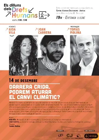 Mentre la ciutadania occidental no és capaç de renunciar als nivells de consum actuals, bona part dels habitants del planeta esperen anar acostant-se als nostres nivells de benestar material. Tot i així, el nostre nivell de producció i consum s’ha aconseguit al preu d’esgotar els recursos naturals i energètics, i trencar els equilibris ecològics de la Terra. Necessitem una societat que tingui com a objectiu recuperar l’equilibri amb la biosfera i preservar així els drets ambientals. Podrem aturar el canvi climàtic? Quins són els principals reptes polítics a afrontar per fer-ho? Quines claus aporta la nova encíclica del Papa Francesc sobre l'ecologia al respecte?Ponents:Aida Vila, llicenciada en dret i responsable de Canvi Climàtic a Greenpeace InternacionalJoan Carrera, sj, doctor en teologia, professor de moral fonamental i bioètica a la Facultat de Teologia de CatalunyaModerador/a:Tomàs Molina Entrada lliure i retransmissió en directe a través de la nostra pàgina web.
