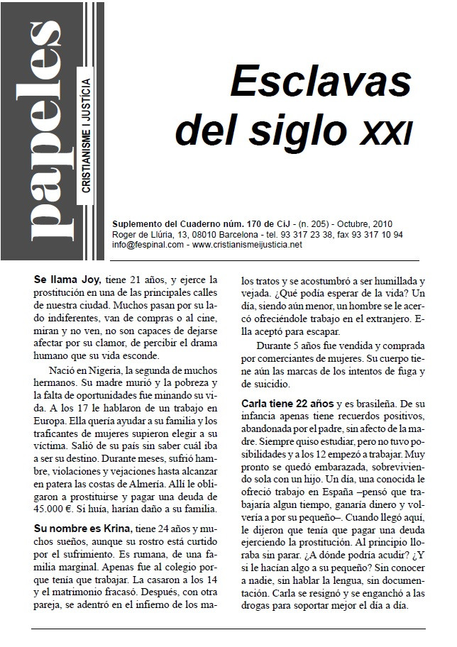 La O.I.T. cuantifica en 2.500.000 el tráfico de personas en el mundo. La mayoría mujeres y niñas. Prostitución, abusos, malos tratos, confiscación de documentos de identidad, amenazas,... Se viola los derechos de las personas y se atenta contra su dignidad e integridad. La pobreza tiene rostro femenino, al igual que la esclavitud. En España, gran parte de las prostitutas son extranjeras, pero el tráfico también afecta, en España y en el mundo, a sectores agrarios e industriales, servicio doméstico o mendicidad.
