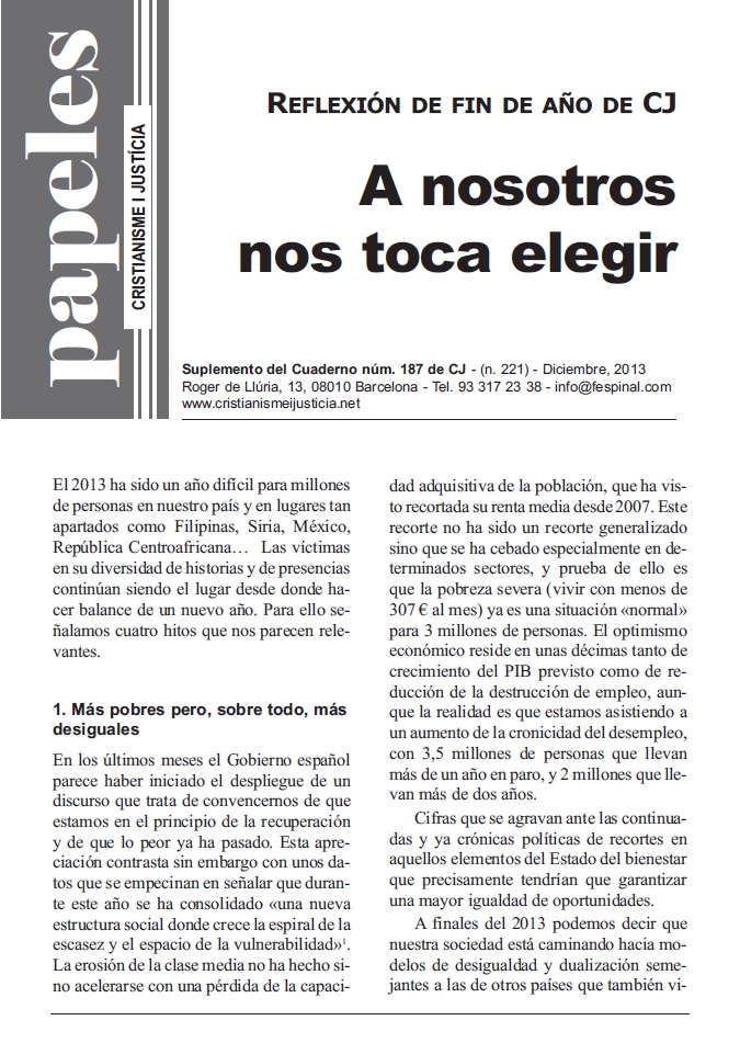 El 2013 ha sido un año difícil para millones de personas en nuestro país y para millones de personas en lugares tan apartados como Filipinas, Siria, México, República Centroafricana… Las víctimas en su diversidad de historias y de presencias, continúan siendo el lugar desde donde hacer balance de un nuevo año. Para ello señalamos cuatro hitos que nos parecen relevantes.