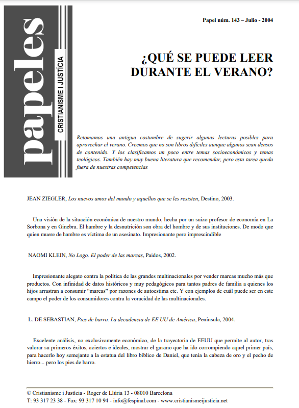 Recomendación de lecturas para el verano. Ziegler, Klein y de Sebastián, sobre los que dominan el mundo y sobre sus víctimas. García Roca, Mourad y Alegre, sobre los pueblos salvadoreño, palestino, israelí y los explotados en general. Johnson trata el lenguaje sobre Dios y el pasado y el futuro de la reflexión cristológica.