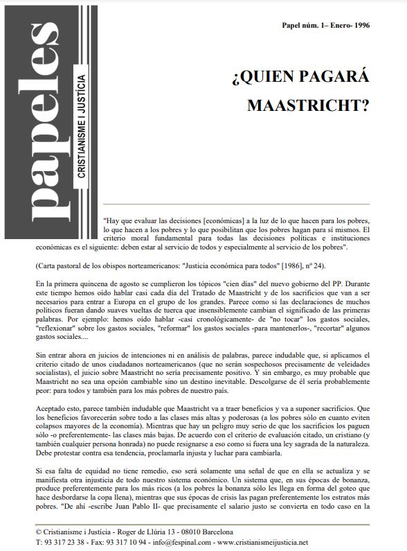 Partiendo de la Carta pastoral de los obispos estadounidenses: "Justicia económica para todos", sobre los pobres, se da una visión crítica de lo que puede representar Maastricht (política exterior y de seguridad común, unión económica y monetaria, una ciudadanía europea) para la población más vulnerable. ¿Dónde irán a parar los beneficios de la nueva situación y quién pagará las crisis? Pregunta importante en el inicio de una nueva etapa, cuando habitualmente el capitalismo favorece el capital por encima del trabajo. Juan Pablo II ya hacía referencia al sistema de injusticia que pesaba sobre el hombre trabajador.