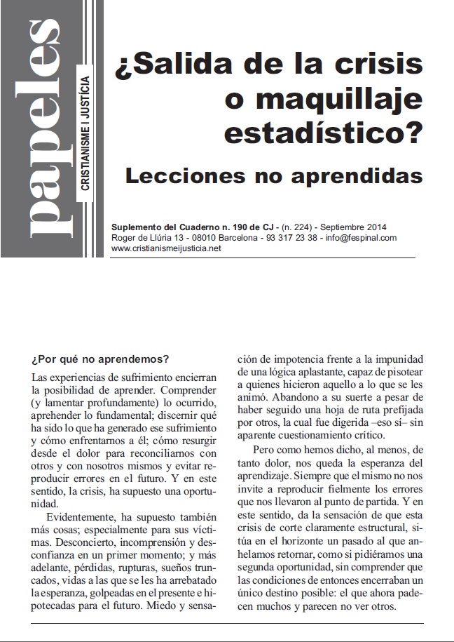 Se impone el discurso de la salida de la crisis, y lo hace apoyado en la estadística. Pero la estadística es un instrumento que se puede utilizar tanto para desvelar como para esconder la realidad. El autor está convencido que una sociedad que ve cómo se incrementa la desigualdad y cómo se debilitan las políticas sociales, no está saliendo de la crisis. O lo está haciendo olvidándose definitivamente de los más débiles, lo cual le resta talla moral y esencia democrática.