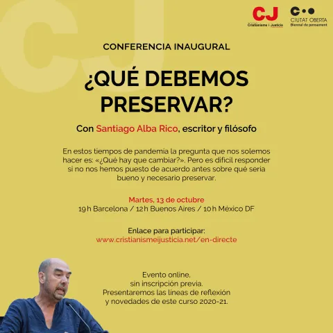 Este martes se ha celebrado la inauguración del curso 2020-21 del Centro de Estudios Cristianismo y Justicia, que este año ha consistido en un acto online. El filósofo Santiago Alba Rico ha sido el encargado de pronunciar la ponencia inaugural, en conexión desde Túnez, con una reflexión sobre qué es lo que hay que preservar, en estos momentos en que parece que lo único que nos preocupa es qué hay que cambiar.