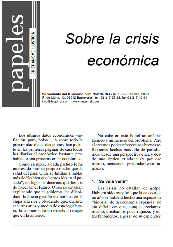 Las crisis no estallan de golpe. Se producen burbujas que van creciendo, si no se detienen a tiempo, hasta que estallan. El capitalismo suele sufrir, cíclicamente, crisis. Cabría preguntarse qué es lo que falla en el sistema económico mundial. Todo el mundo sabía qué estaba pasando con el mercado inmobiliario en España y España estuvo a punto de ser rescatada. Las crisis se deberían superar con el esfuerzo de todos, pero que este esfuerzo no recaiga, a menudo a base de recortes, sobre el sector más débil de la sociedad.