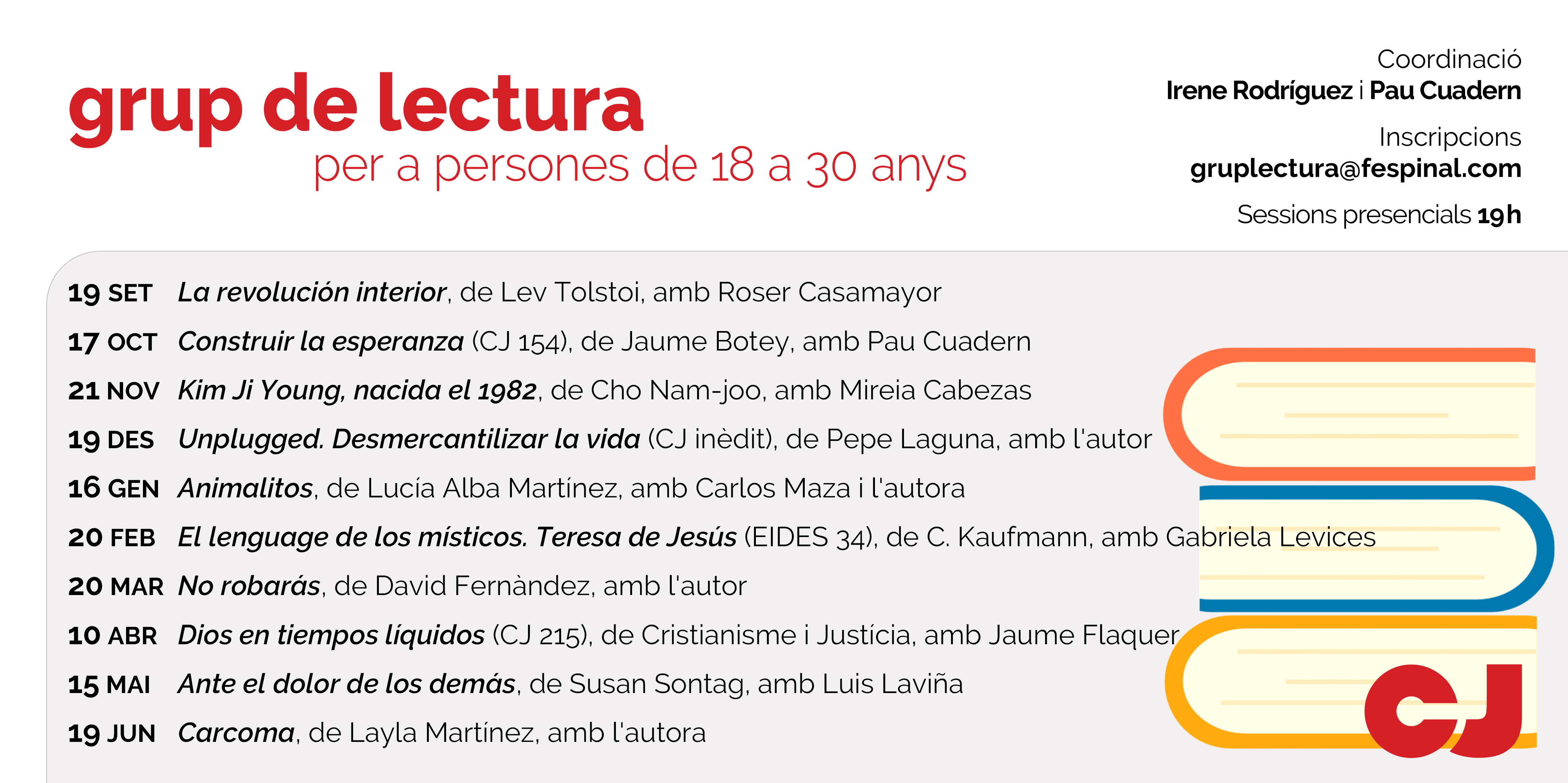 Subscripció al butlletíEl grup de lectura de Cristianisme i Justícia és un espai format per persones d'entre 18 i 35 anys que té per objectiu compartir temps i reflexió al voltant d'algunes lectures.