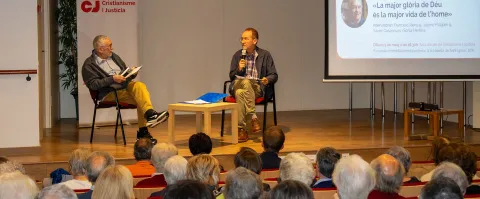 Francesc Riera SJ, en diàleg amb Pep Mària SJ, va parlar del Chalo jesuïta i professor de teologia, tot recordant la confluència d’un context d’efervescència dels anys 60 i d’una generació de jesuïtes, que va acabar generant una renovació en l’àmbit de la teologia. Les conseqüències d’això, pel què fa al treball teològic de José I. González Faus, les van descriure Manu Andueza i Jaume Flaquer SJ, que va intervenir des de Granada. Tots dos van posar l’accent en la centralitat dels pobres en tot el seu pensament i en la seva Cristologia, que, com van explicar, està profundament lligada a l’antropologia i és bona notícia per als pobres.