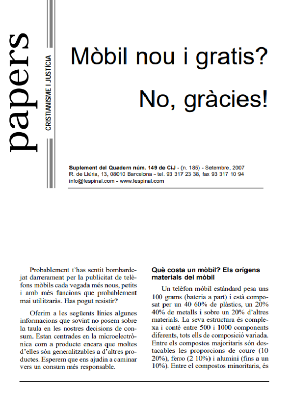 Subscripció al butlletíUna reflexió sobre el que implica la fabricació de mòbils en quant a exhaurir els minerals que ens proporciona un planeta ja ferit i el que representa pels països extractors, en especial al centre d’Àfrica amb el coltan. L’obsolescència tècnica, funcional i psicològica provoca que la població canviï sovint de mòbil amb la consegüent acumulació de residus altament tòxics. Una crida al consum responsable.