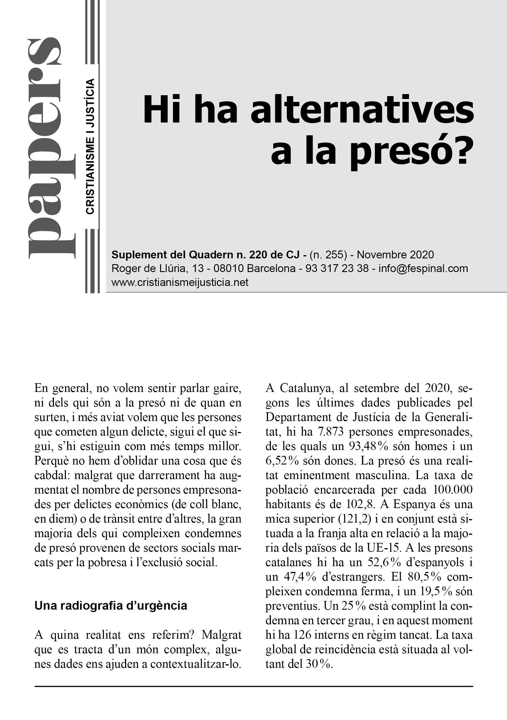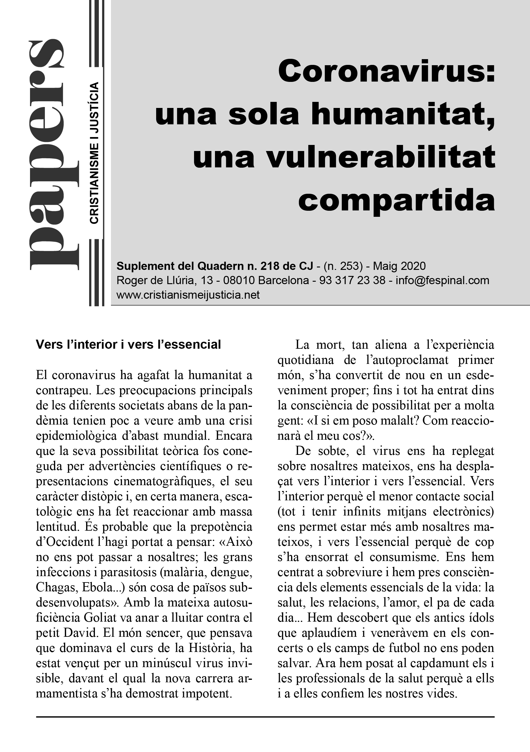 En un format breu i fàcil de llegir es sintetitza la presentació d’un tema d’actualitat. Els Papers més que oferir respostes tancades pretenen despertar en el lector l’interès per seguir buscant i reflexionant. Entenent però, que la brevetat no va renyida ni amb el rigor ni amb la profunditat.