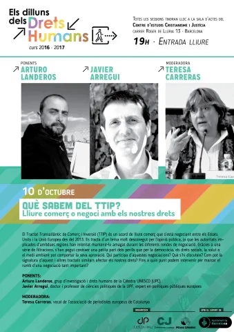 El Tractat Transatlàntic de Comerç i Inversió (TTIP) és un acord de lliure comerç que s’està negociant entre els Estats Units i la Unió Europea des del 2013. Es tracta d’un tema molt desconegut per l’opinió pública, ja que les autoritats implicades d’ambdues regions han intentat mantenir-lo amagat durant les diferents rondes de negociació. Gràcies a una sèrie de filtracions, s’han pogut conèixer una petita part dels perills que per la democràcia, els drets socials, la salut o el medi ambient pot comportar la seva aprovació. Qui participa d’aquestes negociacions? Què s’hi discuteix? Com pot la signatura d’aquest i altres tractats similars afectar els nostres drets? Fins a quin punt podem intervenir per marcar el rumb d’una negociació tant important?Ponents: Arturo Landeros, grup d’investigació i drets humans de la Càtedra UNESCO (UPC) Javier Arregui, doctor i professor de ciències polítiques de la UPF, expert en polítiques públiques europeesModerador/a: Teresa Carreras, vocal de l’associació de periodistes europeus de Catalunya