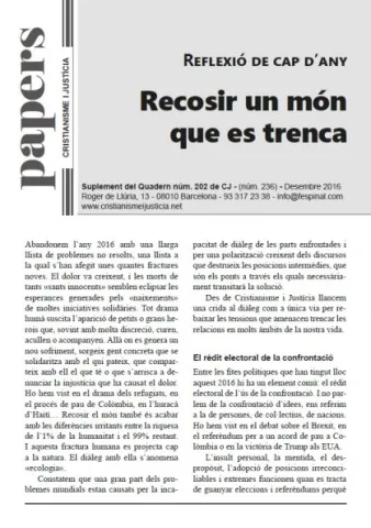 Cristianisme i Justícia, centre d’estudis de la Companyia de Jesús a Catalunya, fa una crida al diàleg en la reflexió que acaba de presentar en acabar l’any 2016. El centre lamenta que “gran part del problemes mundials estan causats per la incapacitat de diàleg de les parts enfrontades”.