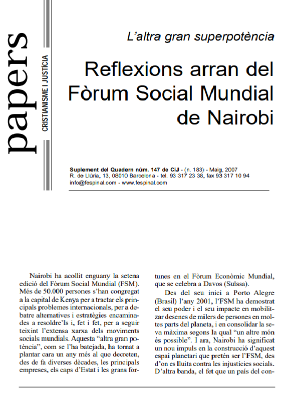 Subscripció al butlletíEl Fòrum Social Mundial arriba a la setena edició, des dels seus inicis a Porto Alegre. Primer fòrum celebrat a Àfrica, Kènia. Àfrica empobrida per antics i nous colonialismes. Una crida a la transformació de l’individu i de la societat. Imprescindible un nou pacte social on drets i deures vagin de la mà. Cal practicar la crítica i l’autocrítica. I cal una agenda que permeti penetrar en les decisions institucionals. Perquè un món millor és possible!
