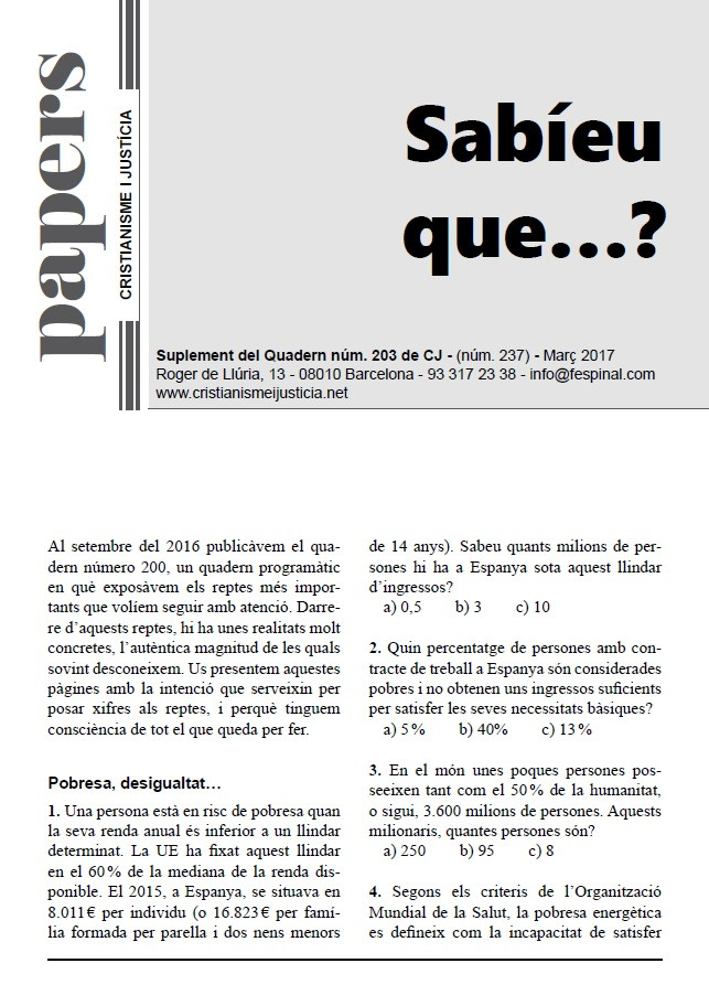 Aquí trobareu les dades referents als principals reptes que des de Cristianisme i Justícia, ens plantejàvem amb la publicació del quadern número 200, al setembre del 2016. Darrere d’aquests reptes, hi ha unes realitats molt concretes, l’autèntica magnitud de les quals sovint desconeixem. Posar xifres als reptes ajuda a prendre consciència de tot el que queda per fer.